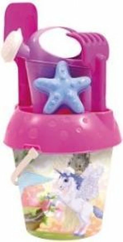 Deze 6-delige emmerset is uitgevoerd in een leuk eenhoorn design. De set bestaat uit een emmer met hengsel en heeft een doorsnede van 13 cm. Tevens wordt de set geleverd met leuke accessoires; een harkje, een schepje, zandvormpje, gietertje en een zeef. De set is gemaakt van kunststof en heeft een robuust design voor jarenlang speelplezier. Ideaal om mee te badderen in bad of leuk voor aan het strand! Geschikt voor kinderen vanaf 1 jaar.
