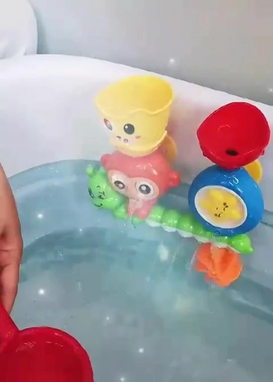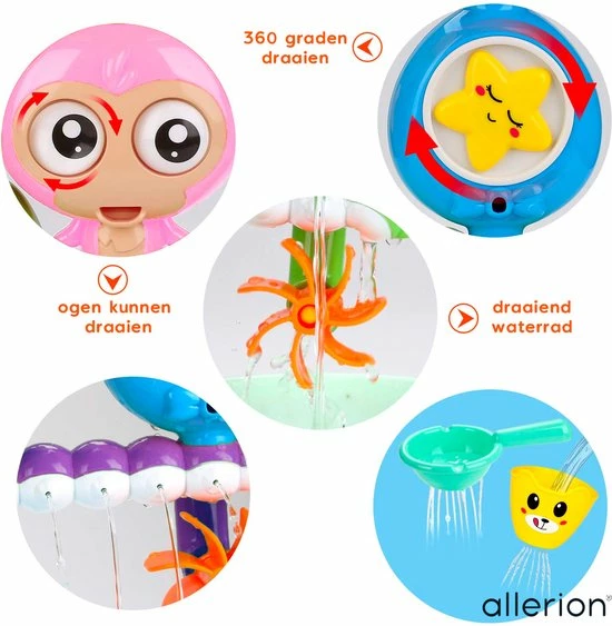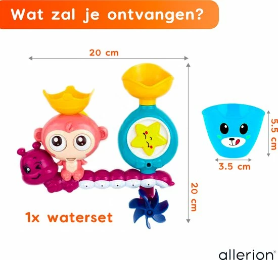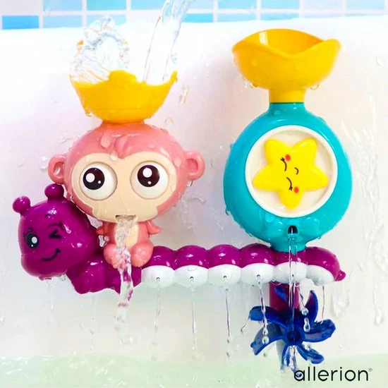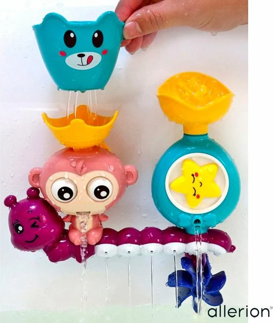 Super leuke vernieuwende badspeelgoed set! Met draaiende onderdelen, vrolijke dieren thema en voor in bad of onder de douche. Zet het speelgoed in elkaar, schep water aan de bovenkant er in, en alle onderdelen beginnen te bewegen! Met maar liefst twee verschillende water-routes! Badderen was nog nooit zo leuk. Voor kinderen vanaf 1 jaar!