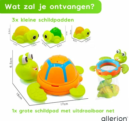 Super leuke uitgebreide badspeelgoed set! Schattige schildpadden speelgoedset voor in bad of onder de douche. Met veel bewegende onderdelen, schepnetje, water spuiter en meer! Badderen was nog nooit zo leuk. Voor kinderen vanaf 1 jaar!