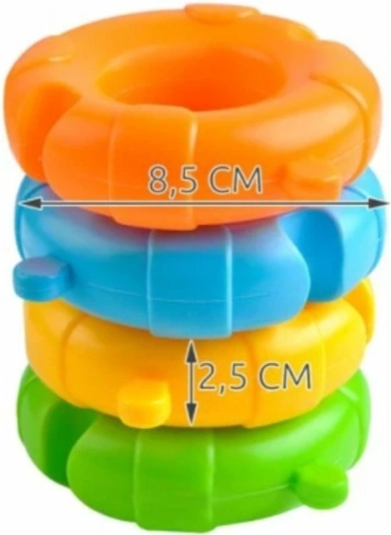 VORMEN, KLEUREN EN MATERIAAL – Onze set bestaat uit 8 elementen die worden gekenmerkt door verschillende vormen, kleuren en het soort materiaal. De 4 plastic reddingsboeien kunnen afzonderlijk of samen met de anderen worden gebruikt. De 4 grappige dieren gemaakt van een rubberachtig zacht materiaal kunnen op de ringen worden geplaatst of in het water worden bespat, ze vullen zich door te knijpen met water.
