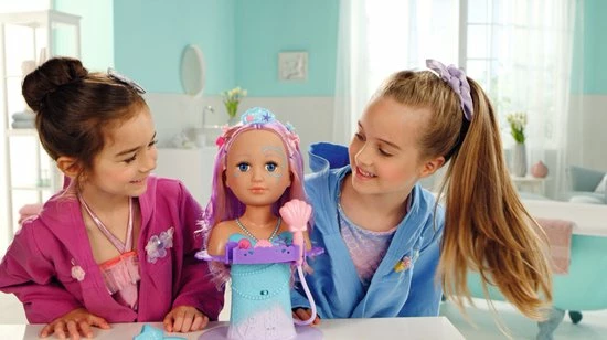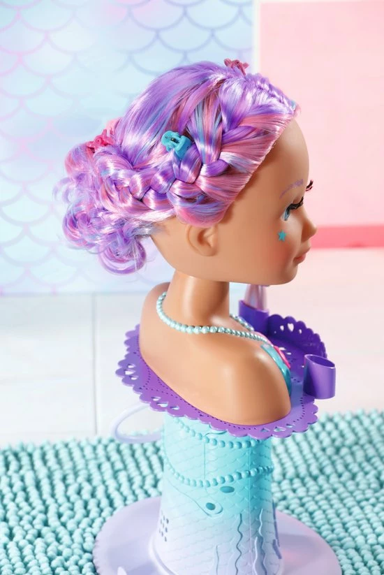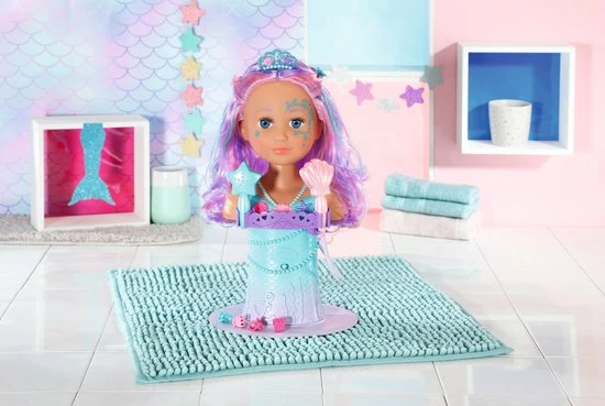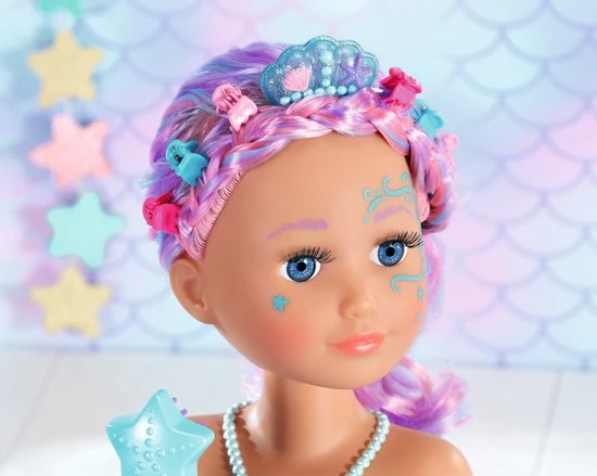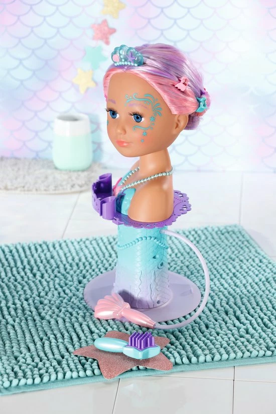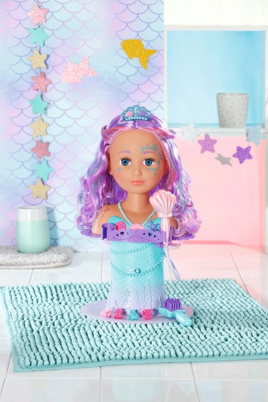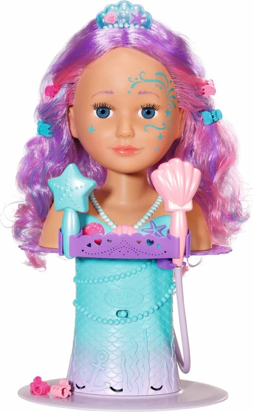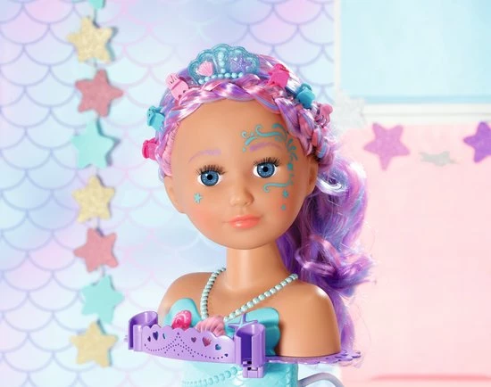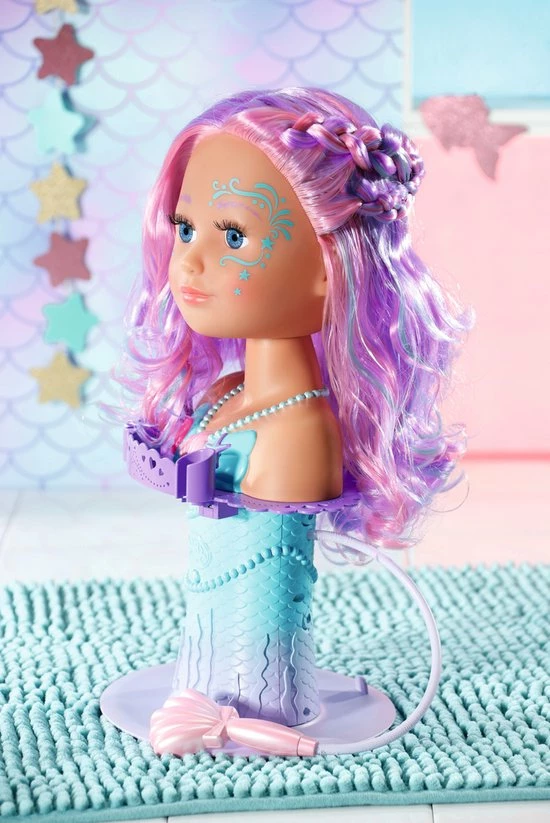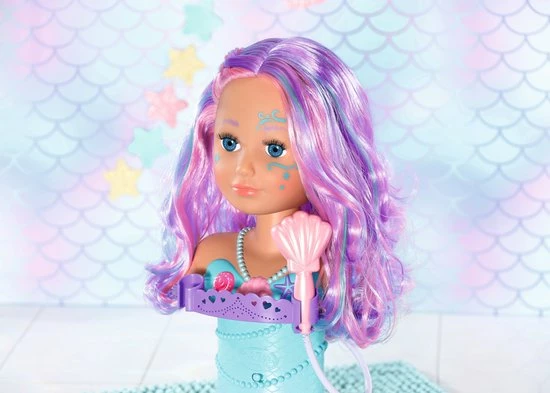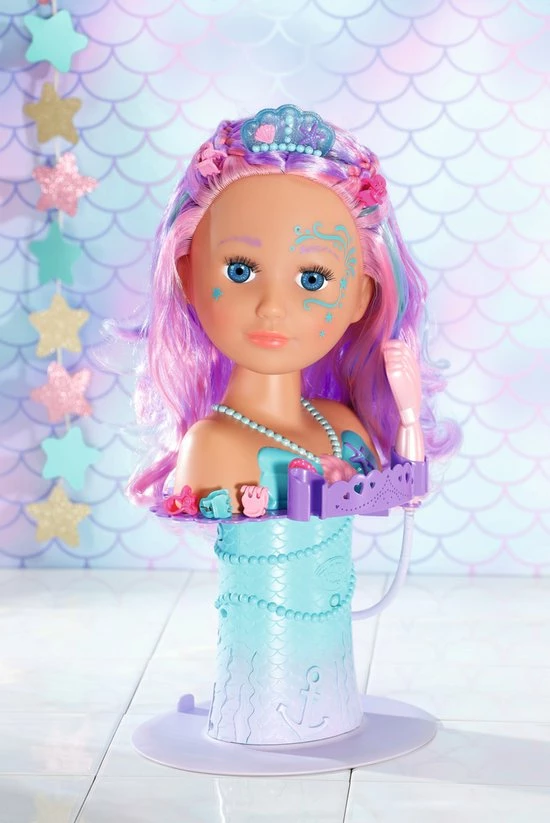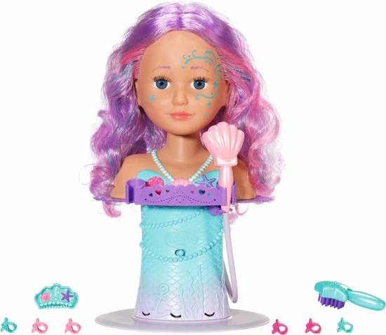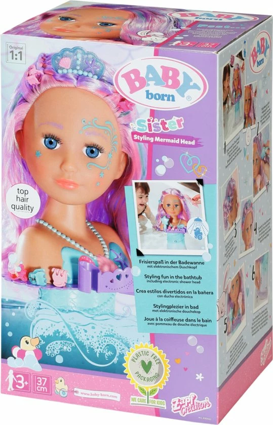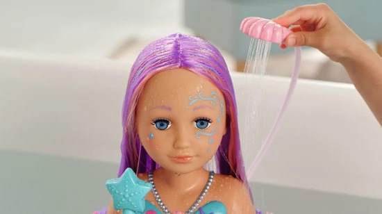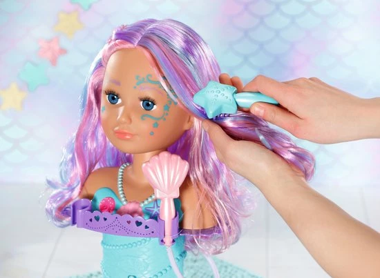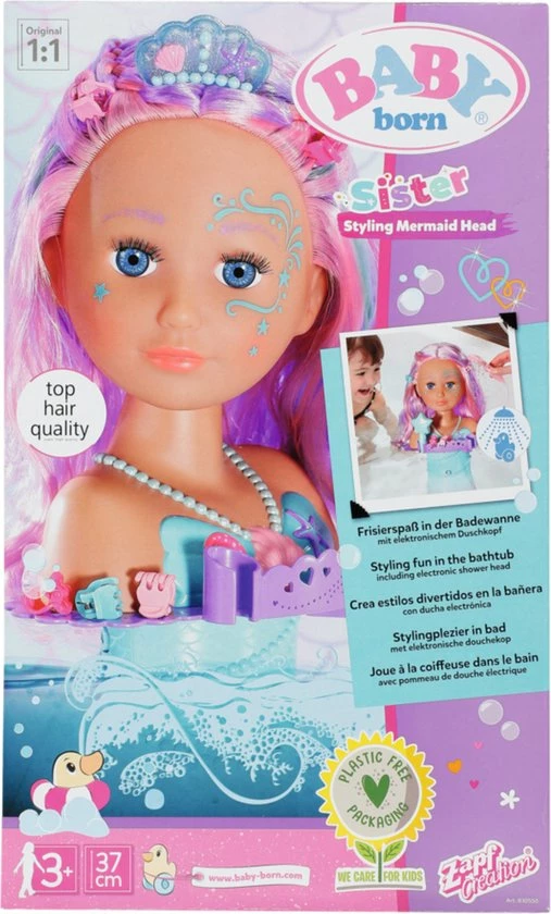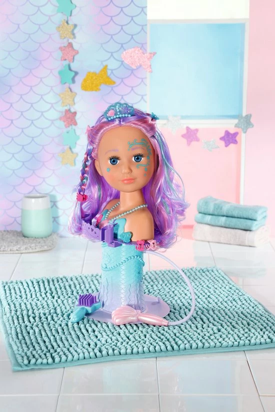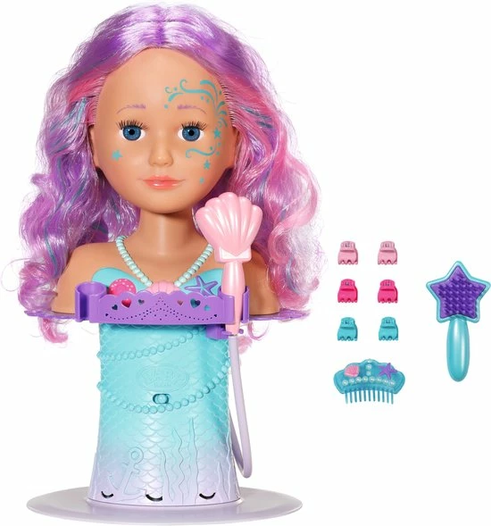BABY born Sister Styling Head Zeemeermin met elektronische douchekop. Inclusief haarborstel, tiara en 6 haarclips.