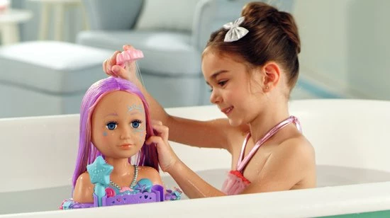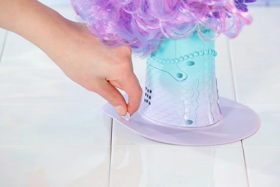 Het kaphoofd met zeemeerminnenthema is de kapsalon voor de badkuip. Plak de zuignap op de bodem van de badkuip, vul de badkuip met water en de jonge kapsters kunnen aan het werk.