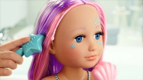 Het veel kleurige haar van uitstekende kwaliteit met de kleurrijke strengen kan steeds opnieuw op heel veel manieren in model gebracht worden. De 6 haarclips en de tiarakam maken een prachtig kapsel nog mooier. De basis die aan het hoofd vastzit heeft een opbergvak voor deze haaraccessoires en klemmen voor de zeesterborstel en de douchekop. Als je de zeestervormige douchekop uit de houder haalt, wordt de pomp geactiveerd en begint het water te stromen. Maar dit werkt alleen als het kaphoofd ook echt in het water staat.