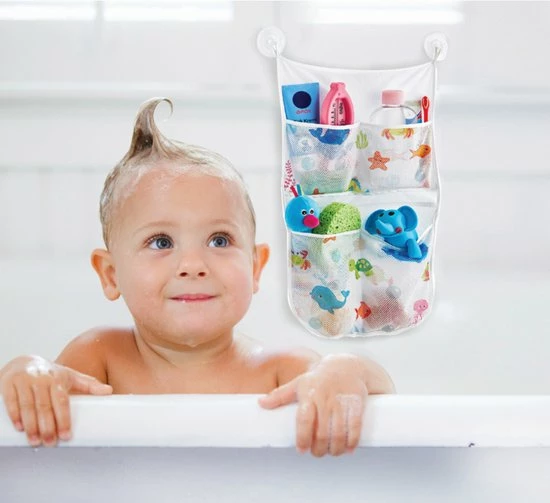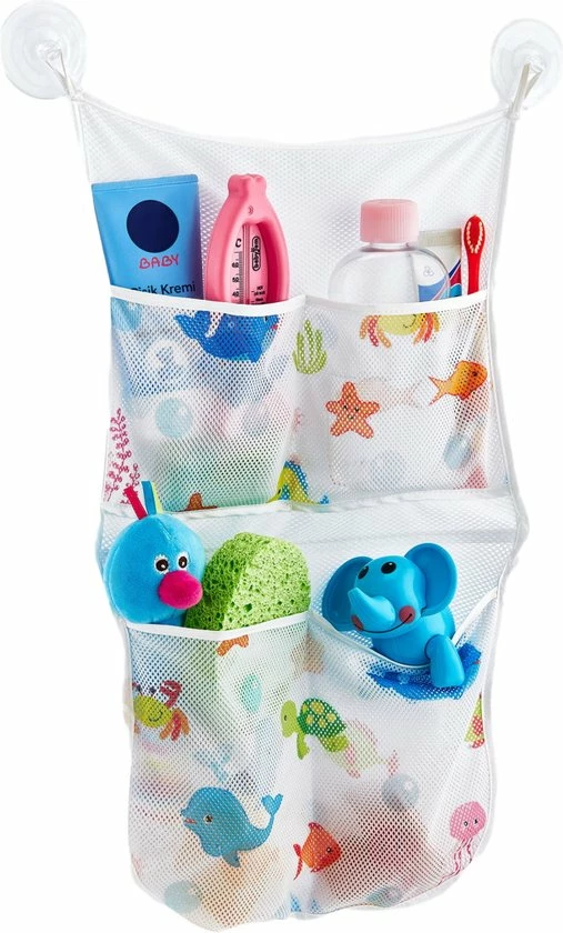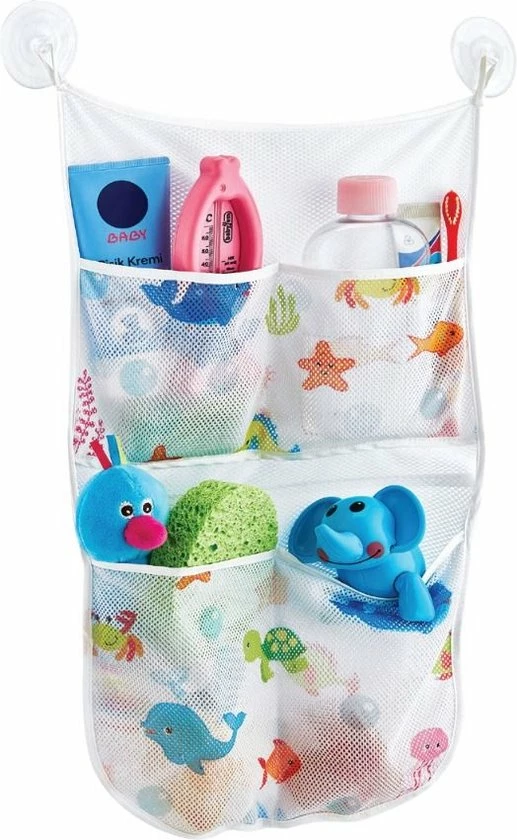 De houder heeft kleine gaatjes, waardoor het speelgoed kan uitlekken. Verder heeft de houder een schattige print met onderwaterdieren en 4 vakken. De badspeeltjeshouder blijft op gladde oppervlakken plakken door de 2 zuignappen.