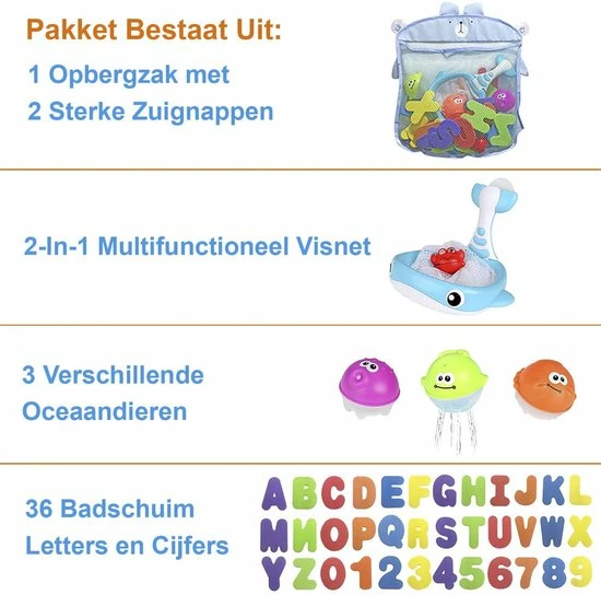 De set bevat een multifunctioneel visnet en 3 verschillende oceaandieren, waar kinderen lekker mee kunnen spelen in bad. Zo zou je zoon of dochter kunnen vissen met het net, maar ook een potje basketbal in bad is een optie. Het net kan opgehangen worden aan de muur door middel van de zuignap, of gewoon in de hand gehouden worden.