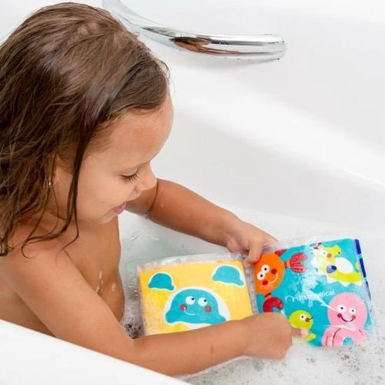 Zacht gevoerde waterdicht boek met vijf geïllustreerde pagina’s en een pieper op de middelste pagina.