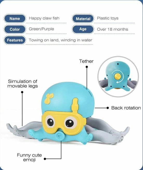 - Dit peuterspeelgoed wordt door een uurwerk aangedreven. Het zweeft en zwemt als een echte octopus. De kleur van het babybadspeeltje zal aangenaam zijn en het zal gemakkelijk de aandacht van kinderen trekken en ze laten baden.