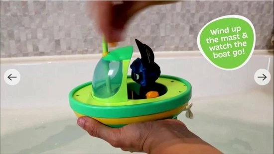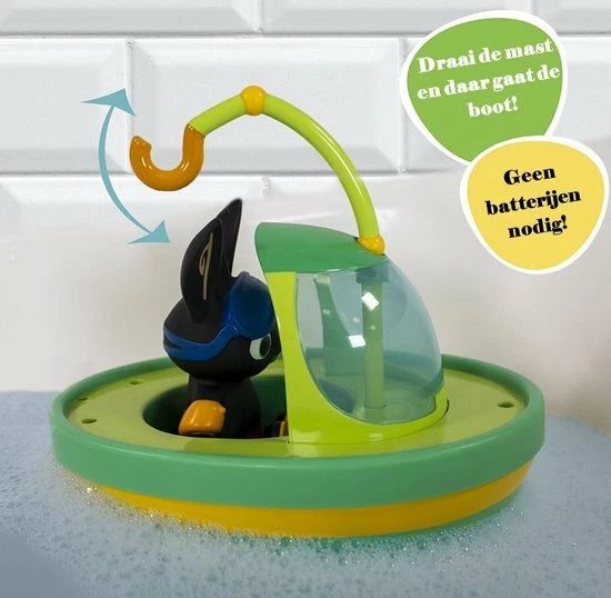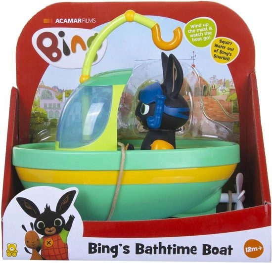 Het is één en al badplezier met deze opwindboot van Bing! Bingsters zullen dol zijn op badtijd met Bing terwijl hij water uit zijn snorkel spuit en in zijn boot door het water drijft. Wind de mast op en kijk hoe de propeller draait, zoefff… daar gaat Bing in zijn rode zwembroek, zwembandjes en bril. Inclusief een Bing waterspuiter die in de cabine van de boot kan worden geplaatst! Alle mechanische functies zijn opwindbaar, dus geen batterijen nodig. Leeftijdsindicatie: 12 maanden+.