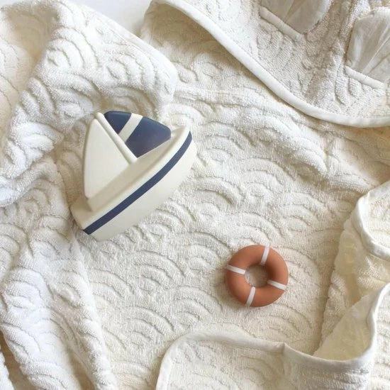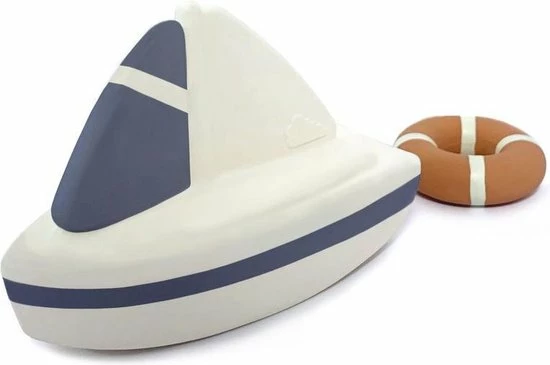 Leuke set van twee badspeeltjes in de vorm van een stoere zeilboot in klassieke witte en marinekleuren met een feloranje reddingsboeiring. De verschillende vormen maken het badspeelgoed aantrekkelijk voor kleine handjes en stimuleren de zintuigen van het kind. Perfect voor veel plezier in bad. Het badspeelgoed is gemaakt van 100% natuurlijk rubber, volledig vrij van BPA en andere potentieel schadelijke stoffen, en met de hand beschilderd met kindveilige verf op waterbasis. Om bacteriën en schimmels te voorkomen, hebben de Bath Toys geen ventiel dus kunnen er geen bacteriën in komen waardoor deze veilig en hygiënisch is voor baby,s. Na gebruik afspoelen met water en afdrogen en niet in direct zonlicht bewaren. De set wordt geleverd in een mooie geschenkverpakking
