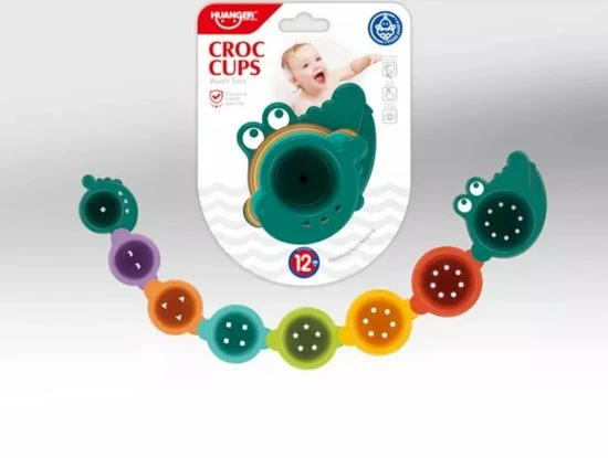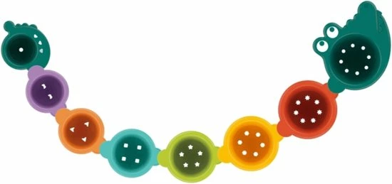 Super leuk Bad speelgoed voor de allerkleinste , totaal 8 cups met gaatjes , waar het water doorheen kan lopen daarbij kunnen de cups aan elkaar geklikt worden om zo een lange krokodil te maken of op elkaar stapelen.