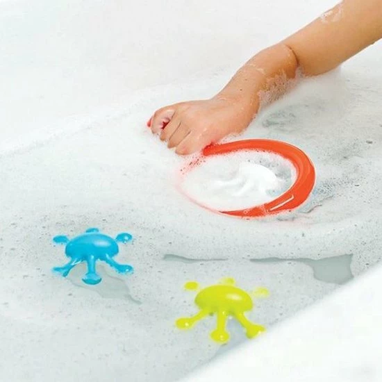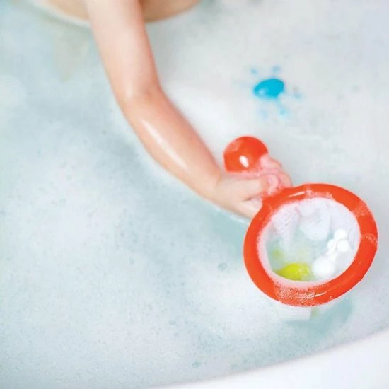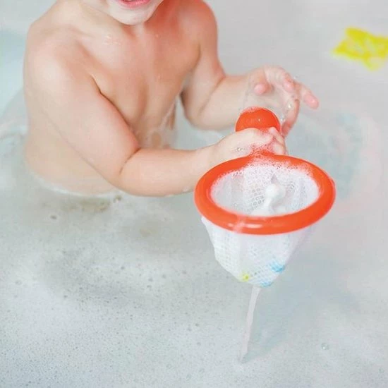 Schep de dobberende badspeeltjes uit het water met het vangnetje. De set bevat drie drijvende speeltjes en een vangnetje.