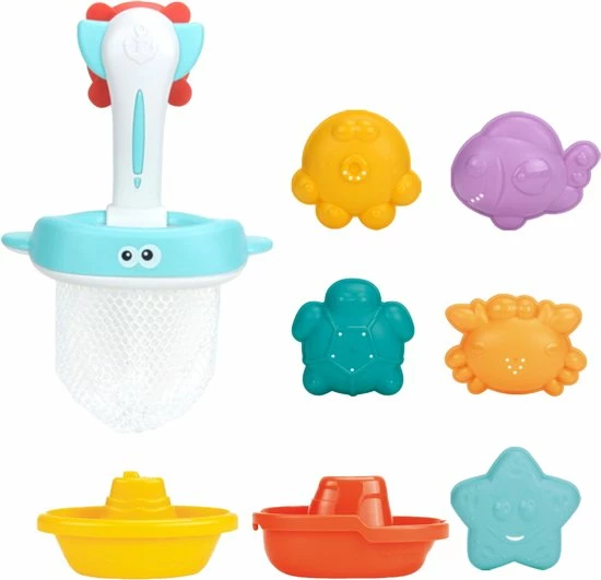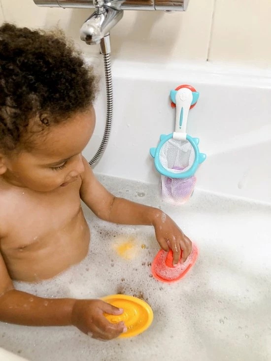 De houder is 25 bij 18 cm en wordt geleverd met 5 zeedieren en 2 bootjes. Door middel van het netje kun je gemakkelijk alle badspeeltjes uit het bad vissen. De set is geschikt vanaf 1 jaar.