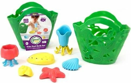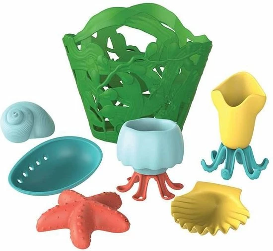 Btreng plezier en leren over getijdepoelen en spelen in de watertafel naar het bad. Deze 7-delige speelset bevat een zeester, sint jacobsschelp, zeeoor, zeeslak, inktvis en kwal, en er zit een leuke mand met zeewierpatroon bij.