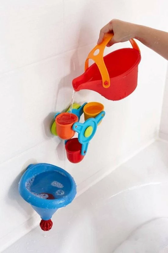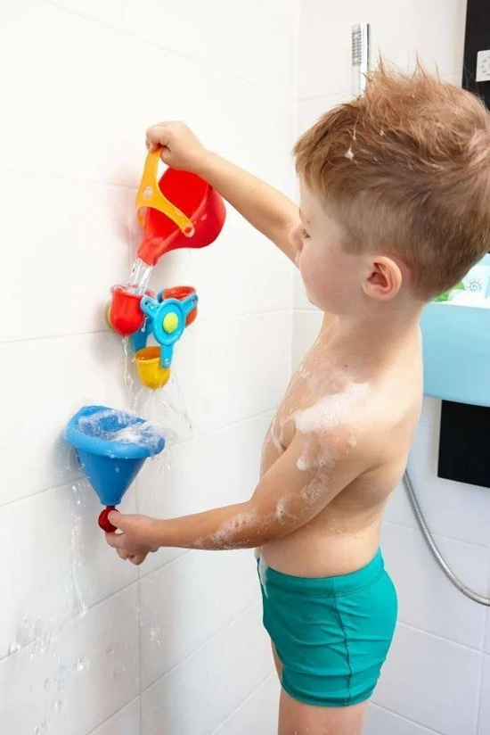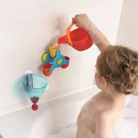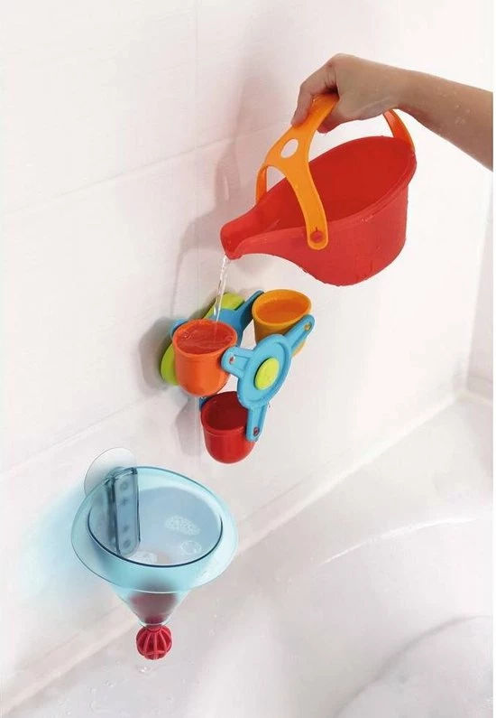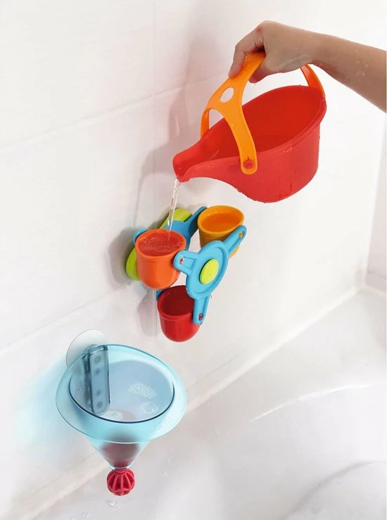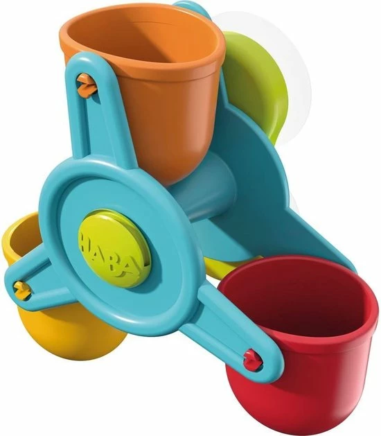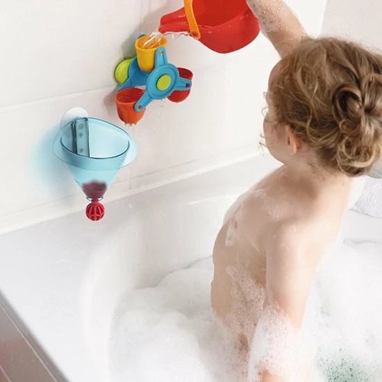 Met dit badspeelgoed heb je badplezier maal drie: leuke watereffecten met opwindende giet-, trechter- en kleureffecten! Het waterrad kan heel snel draaien en fascineert zo de kleinsten met zijn flitsende kleuren. De grote trechter kan niet alleen snel met de gieter worden gevuld, maar ook in een handomdraai weer worden leeggemaakt: druk het ventiel één keer kort naar boven en plop, het water stroomt eruit!