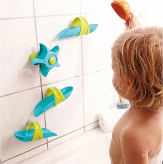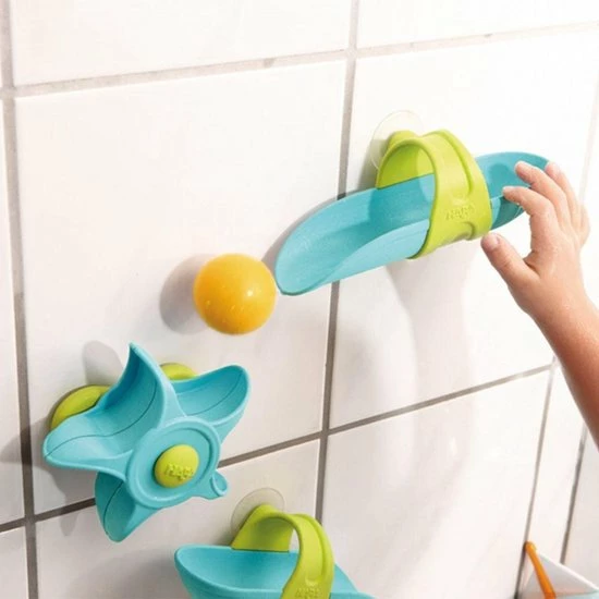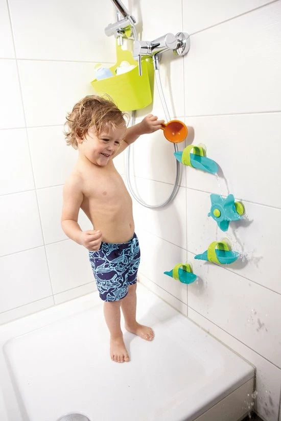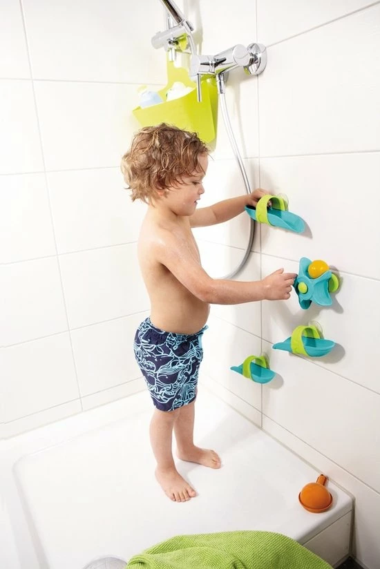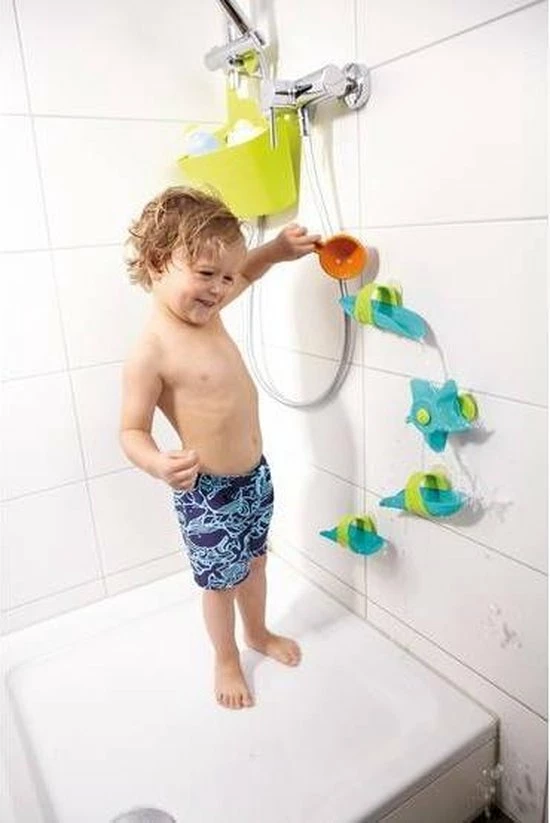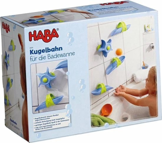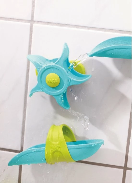 Deze HABA Waterval speelbaanset zal ervoor zorgen dat uw kind met plezier in bad gaat, aangezien het waterwiel voor eindeloos vermaak verzorgt. Maak de zuignappen vast en het uitbundige spelen in bad kan beginnen. Zodra de baanstukken en het waterwiel vastzitten kan het speelplezier beginnen; de bal rolt snel over de baan en het waterwiel voordat hij in het water plonst. Uw kleine baanbouwers kunnen de baanstukken op iedere manier neerzetten en er dan water overheen gieten met de meegeleverde lepel. Deze badspeelgoedset moedigd experimenteren en creativiteit aan.