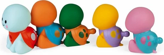 Voor kinderen van 10 maanden en ouder 5 schildpadden om eindeloos in elkaar te zetten en terug uit mekaar te halen! De 3 kleinste schildpadden zijn dol op plezier. Druk op hun buik en ze spuiten water! Ontwikkel de motoriek en behendigheid voor gegarandeerd uren speelplezier in bad.