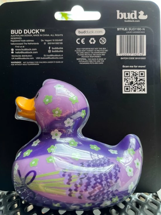 Budduck Lavender Duck , 12 cm badeend in blisterverpakking…. kijk naar deze prachtige lavendel thema badeend en sluit je ogen ….. voel de warme zomerdagen rijdend op een fiets langs de prachtige en geurende lavendelvelden in de Provence…. onvergetelijk voor de zintuigen…