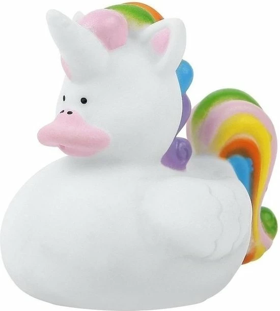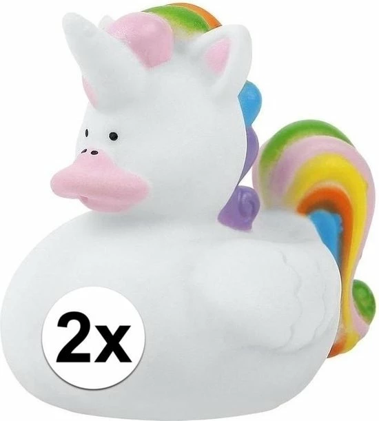 2x Rubberen eenhoorn badeendjes. Afmeting: ca. 7 x 4,5 x 6 cm. De eenhoorn heeft een gaatje onderin waardoor deze kan piepen en is niet BPA-vrij. Niet geschikt voor kinderen onder de 3 jaar.