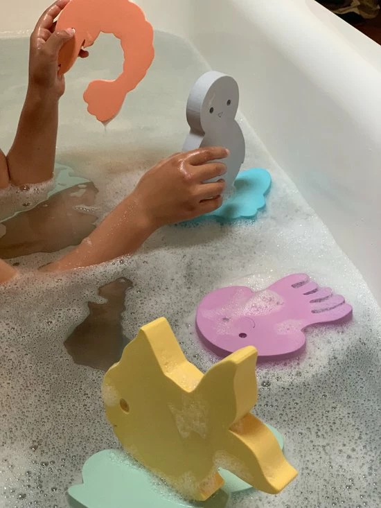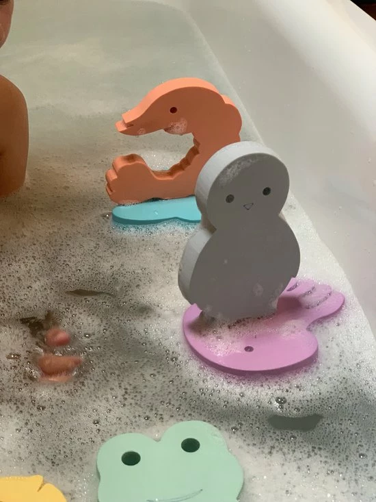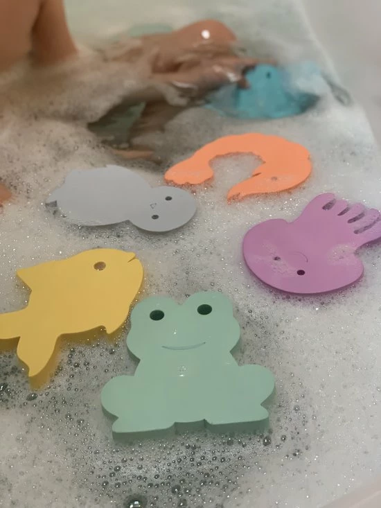 Met deze leuke Waterfun jumbo set die bestaat uit 6 herkenbare dieren uit de onderwaterwereld beleven kinderen de leukste avonturen in bad, douche, zwembad,… . De manta, kwal, goudvis, kikker, garnaal en de pinguin nemen je mee op het leukste onderwater avontuur. De diertjes kunnen blijven plakken aan de bad – of douchewand , je kan een vlot bouwen door de figuurtjes op elkaar te stapelen en nog veel meer met deze unieke Waterfun Jumbo set van MOES.