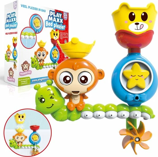 PlayMaxx badspeelgoed bestaat uit meerdere onderdelen die beginnen te draaien op het moment dat jij of je kind er water aan toevoegt. Draaiende onderdelen zijn de ogen van een aapje, een glimlachende ster en een watermolen.