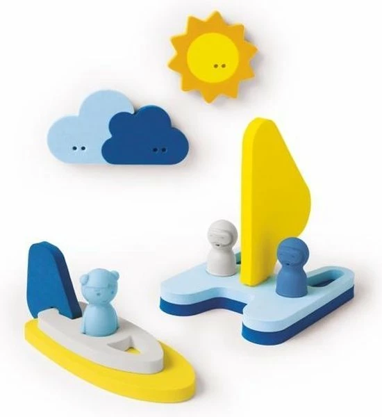 De verschillende vormpjes in elkaar steken helpt kinderen hun fijne motoriek te verbeteren en stimuleert hun creativiteit en fantasie. Alle figuurtjes zijn gemaakt van zacht schuim waardoor ze blijven drijven. De set bevat ook 2 vingerpopjes gemaakt van duurzaam plastic.