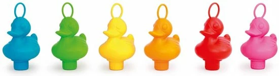 De kleuren van de eendjes zijn roze, rood, oranje, geel, groen en blauw