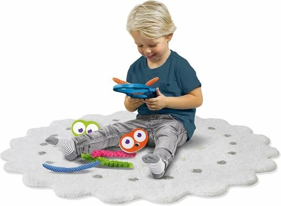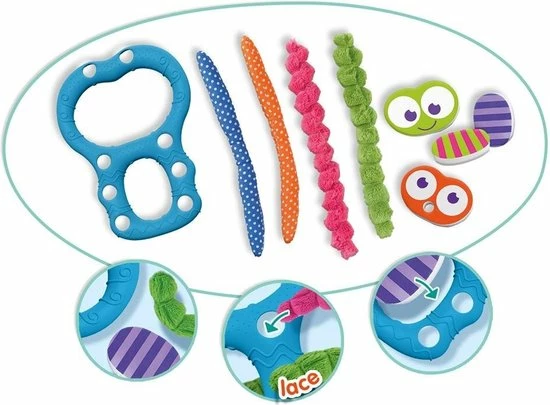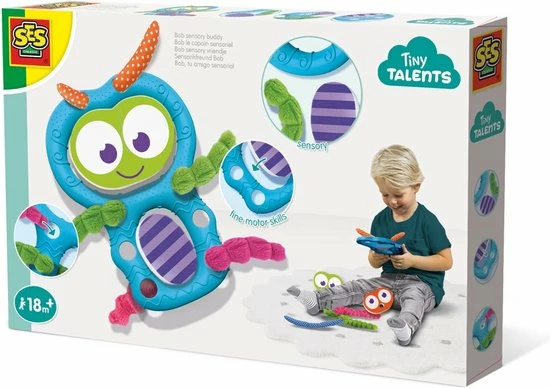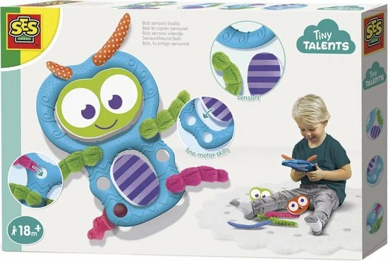 Als peuter moet je de hele wereld nog ontdekken. Met Bob het sensory vriendje van SES ontdek je met je zintuigen verschillende materialen, kleuren en vormen en tegelijkertijd maak je je eerste stapjes in de ontwikkeling van je fijne motoriek. Friemel en voel lekker aan de verschillende materialen en probeer de hoofdjes en lijfjes van foam te wisselen en de verschillende textielen slierten door de gaten te rijgen.