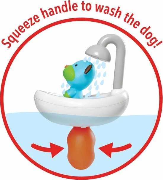 Dit leuke hondje Zoo Squeeze & Shower dog badspeelgoed, toont kinderen hoe ze hun hoofdje moeten achteruit hellen om de haren te spoelen. Druk het luchtpeertje in onder water om de douche te laten stromen. Het hondje is afneembaar en het badspeelgoed blijft drijven in het water.
