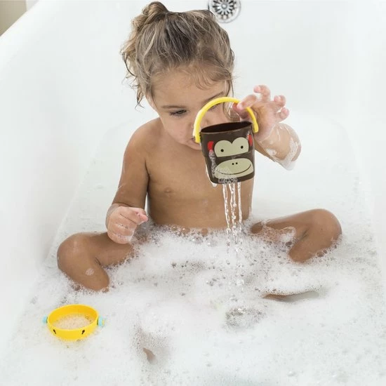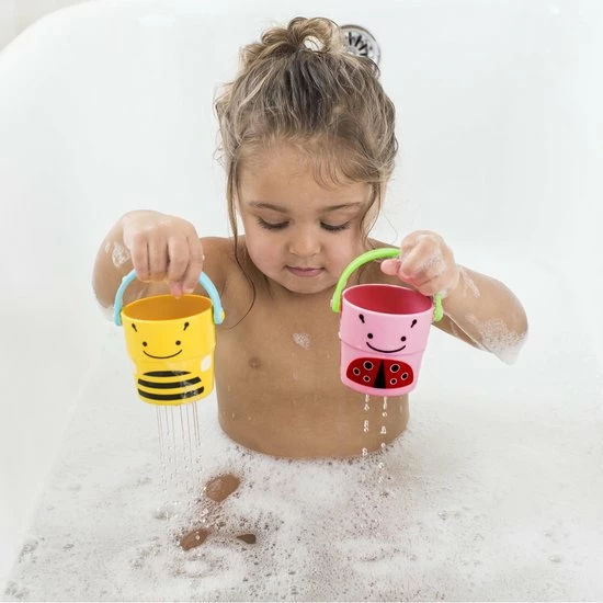Deze kleurrijke emmertjes zijn ideaal om de motorische vaardigheden te stimuleren. Makkelijk vast te houden voor kleine handjes en dat zorgt voor eindeloze waterpret in bad. De kids kunnen de emmertjes vullen en het water laten weglopen door de drie verschillende sproei patronen onderaan in de emmertjes. Als de badtijd voorbij is, kun je ze makkelijk stapelen en opbergen.