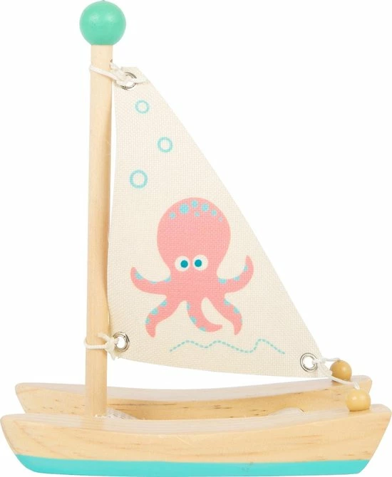 Met deze houten catamaran is plezier op volle zee onvermijdelijk. Uitgerust met twee rompen, een zeil en een steundek waarop ruimte is voor speelfiguren, staat niets een zeiltocht in de badkuip, het peuterbad of het zwembad in de weg. Voor een lange levensduur speelgoed na elk gebruik uit het water halen en goed afdrogen. Versierd met een octopus in een kindvriendelijk ontwerp, moedigt deze boot kinderen aan om fantasierijk rollenspel te spelen. Een enorm plezier voor kleine kapiteins!