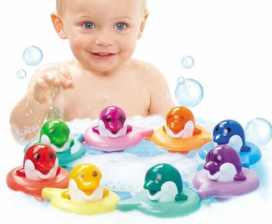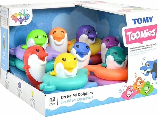 Elk van deze vrolijke Do Re Mi Dolfijnen van TOMY speelt zijn eigen muzieknoot wanneer je erop tikt! Hang ze aan elkaar in een drijvende circel of lijn en zorg dat ze allemaal in hun eigen gekleurde ring zitten. Tik ze achter elkaar aan en maar je eigen muziek in bad. Verwissel ze van volgorde en verander je eigen melodie. Volop waterpret en muziek in bad! Eindeloos speelplezier tijdens het badderen, in het opblaasbadje of pierenbadje. Met de badspeeltjes van TOMY wordt badtijd nog leuker!