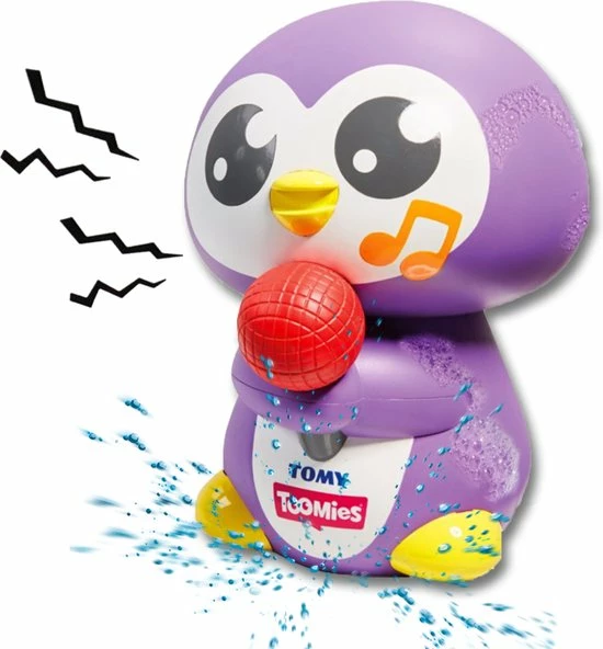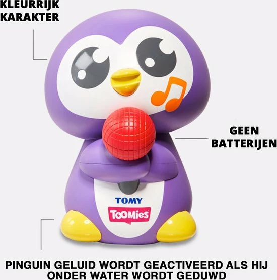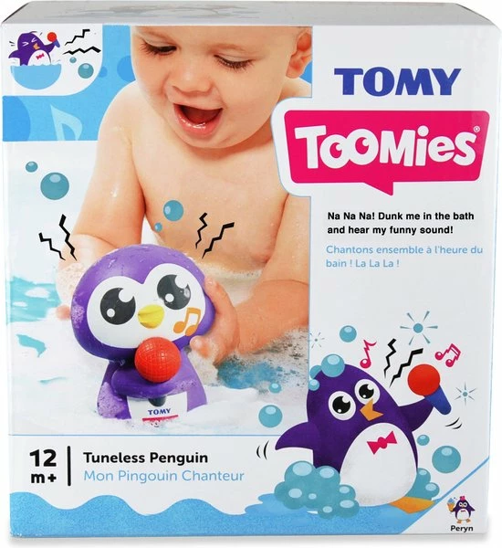 In bad gaan wordt nu nog leuker met Toomies Tuneless Penguin! Deze Pinguin drijft op het water en als je hem onder water duwt, zal hij zijn pinguin geluid laten horen! Duw hem volledig onder water en zie hoe hij bubbeltjes blaast uit zijn kop. Hij is gemaakt van materiaal dat eenvoudig vast te pakken is en kleintjes zullen zijn vrolijke kleuren en lieve oogjes superschattig vinden. Hij heeft een rode microfoon tussen zijn flippers en ziet eruit als een echte superster! Als je hem onder water duwt, komt hij altijd weer vanzelf naar boven. Als Penguin even stil valt, schud hem dan goed leeg en hij zal weer klaar zijn om zich te laten horen! Geen batterijen nodig. Leeftijdsindicatie: 12 maanden+.