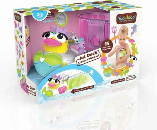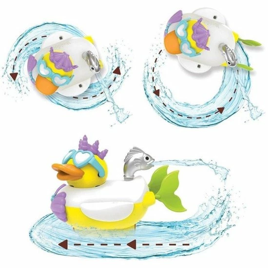 Wanneer je kindje haar aan zet dan begint ze te zwemmen. Je kindje kan het eendje sturen door het waterkanon te draaien. Het waterkanon werkt dus als een stuwmotor en zo racet de Mermaid Duck door het bad heen. Kan je kindje hem weer vangen? Het water wordt uit het bad aangezogen aan de onderkant van het eendje en komt door het waterkanon weer naar buiten. Er moet minimaal 10 cm water in het bad zitten om de Yookidoo Mermaid Duck te laten werken.