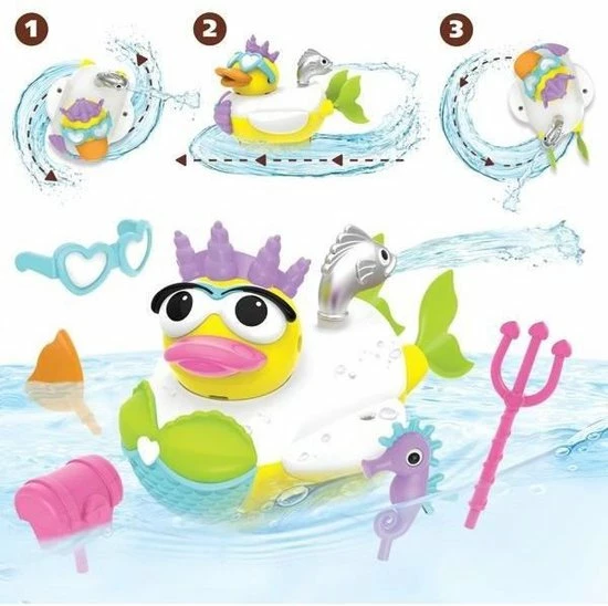 Je kindje zal urenlang badplezier hebben met deze leuke zeemeermin-badeend! Je kunt de eend zelf een zeemeermin uiterlijk geven met de 15 verschillende thema-accessoires. De eend wordt aangedreven door batterijen en zwemt rond in het water. Met de meegeleverde speeltjeshouder kun je de accessoires handig bij elkaar houden.
